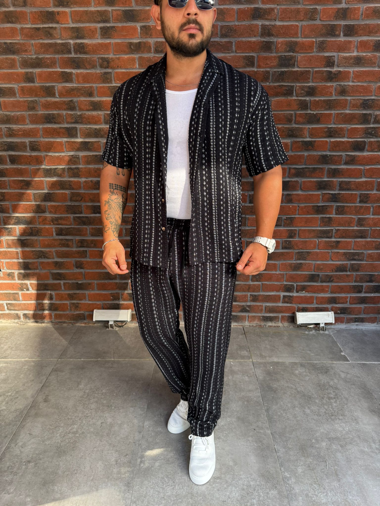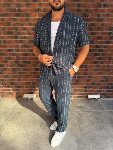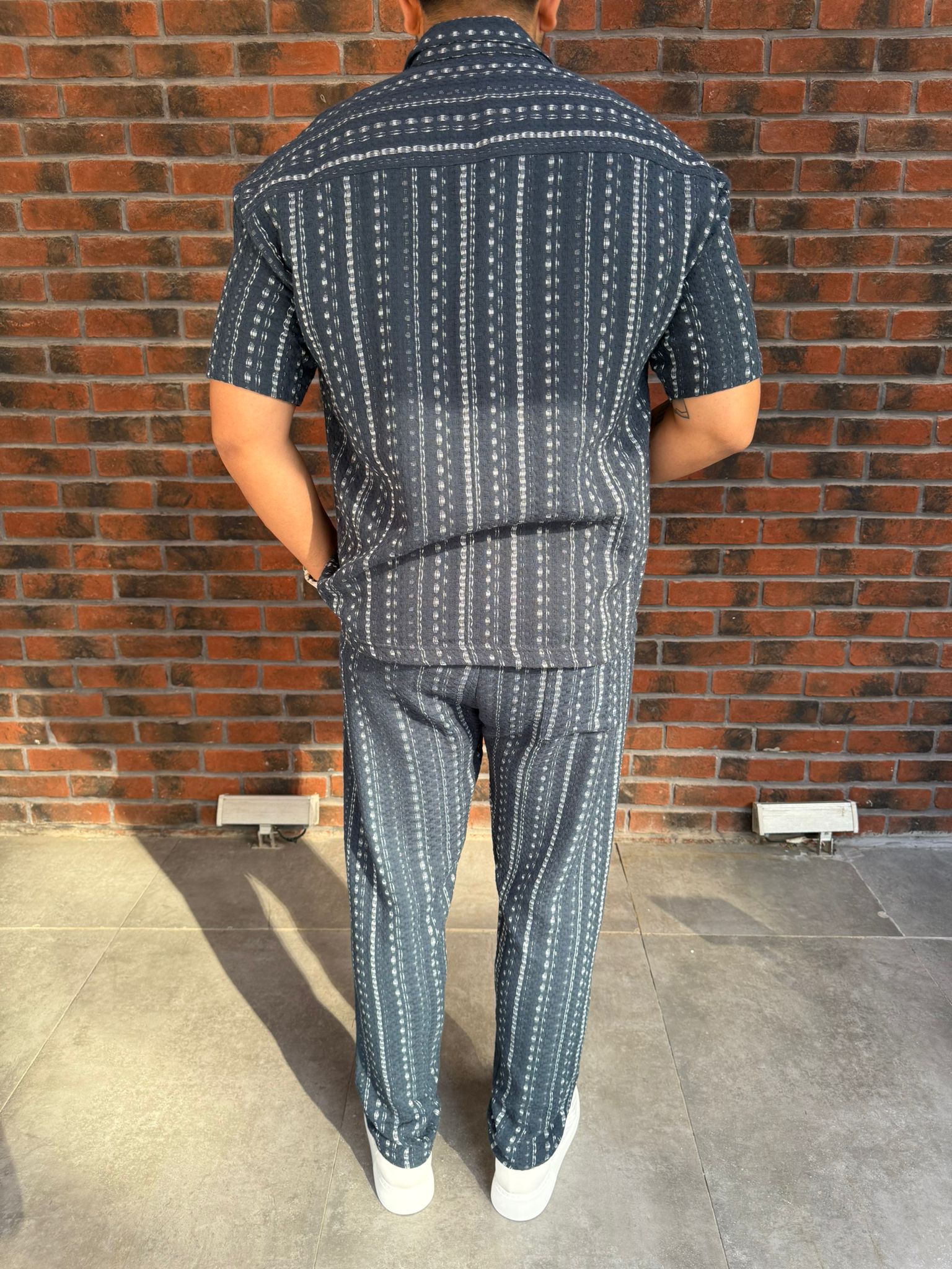 Petrol Mavi Kendinden Desenli Kısa Kollu Örme Gömlek-Pantolon Takım