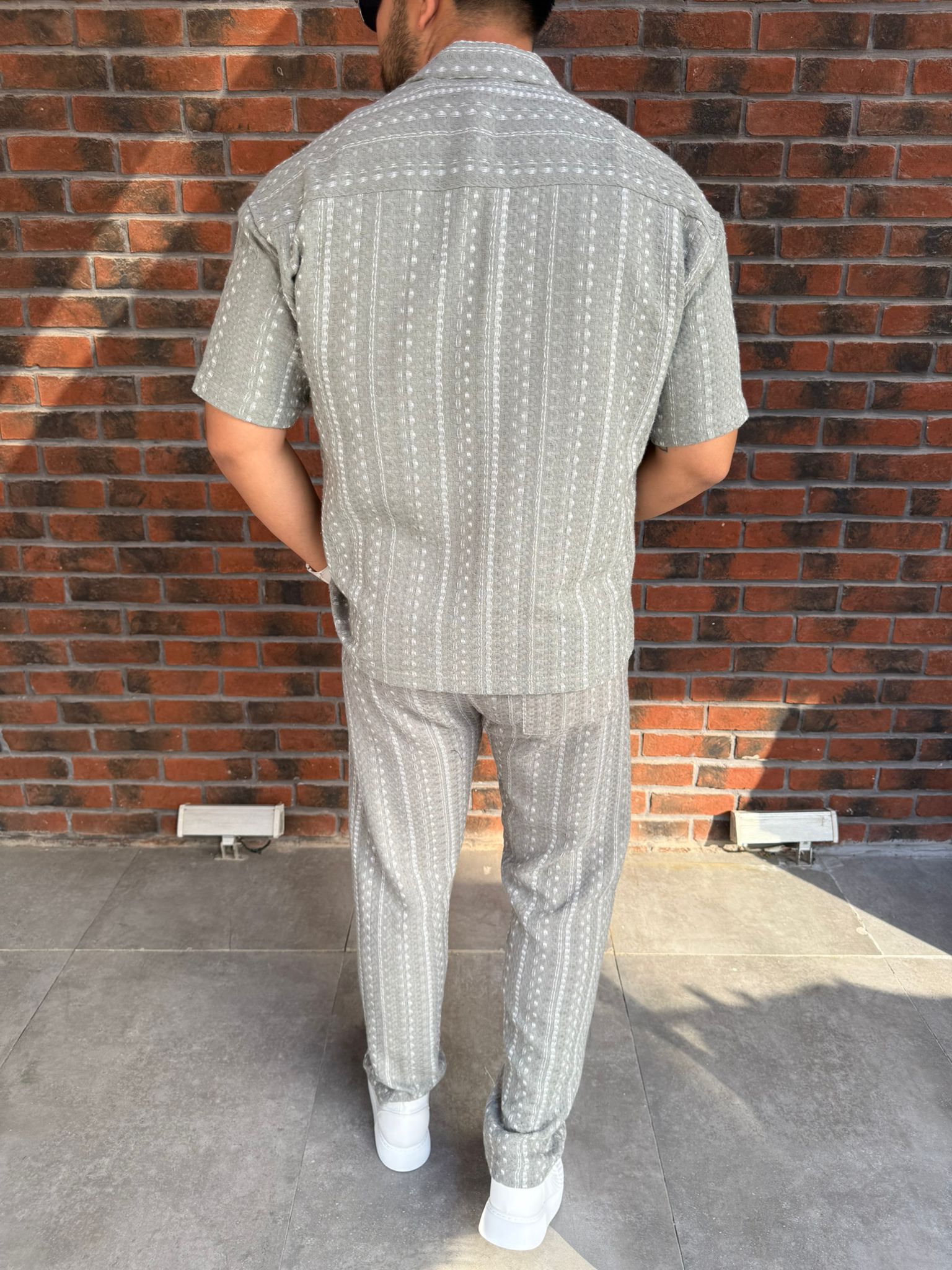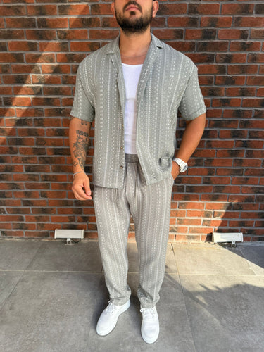 Yeşil Kendinden Desenli Kısa Kollu Örme Gömlek-Pantolon Takım
