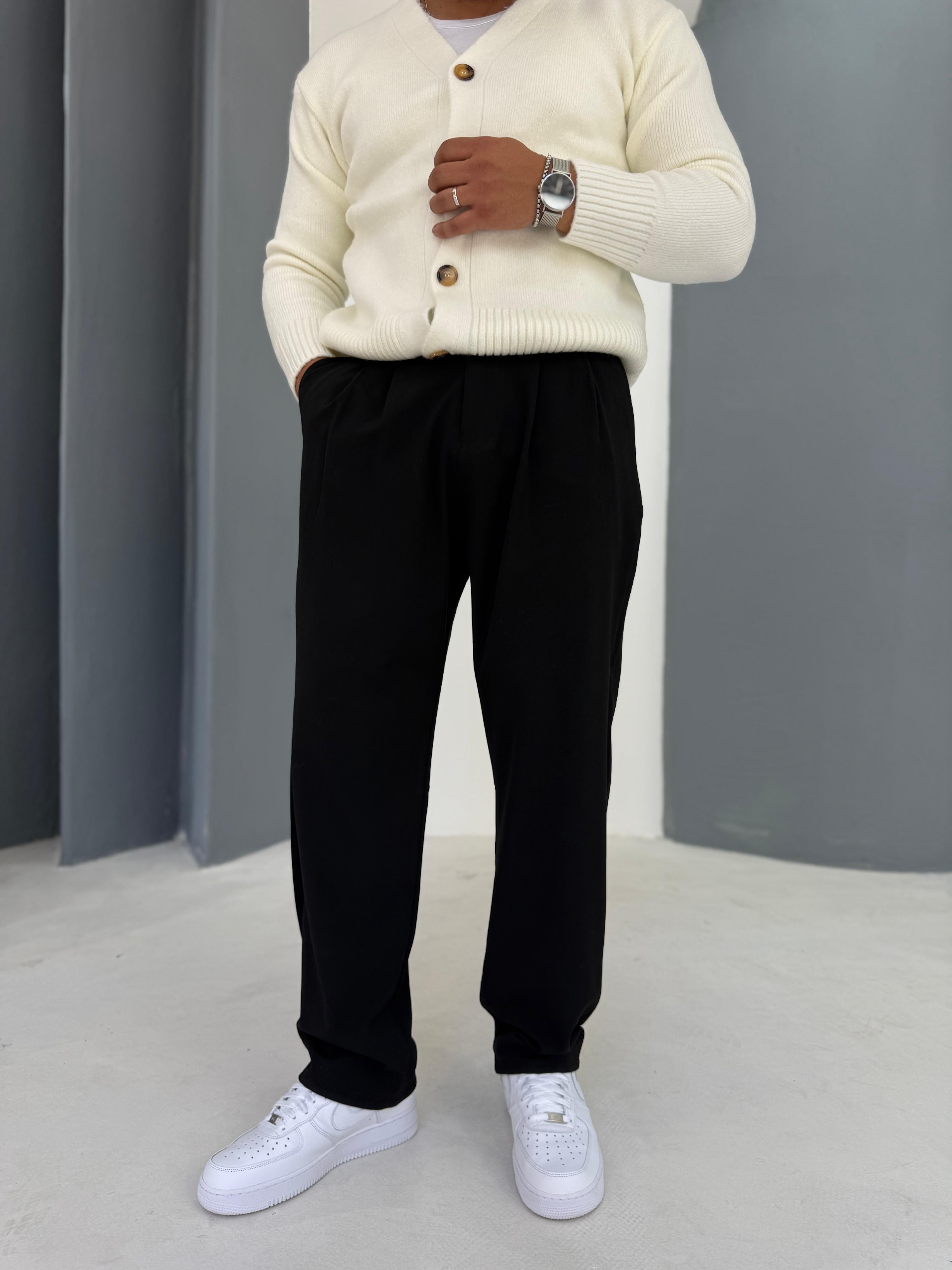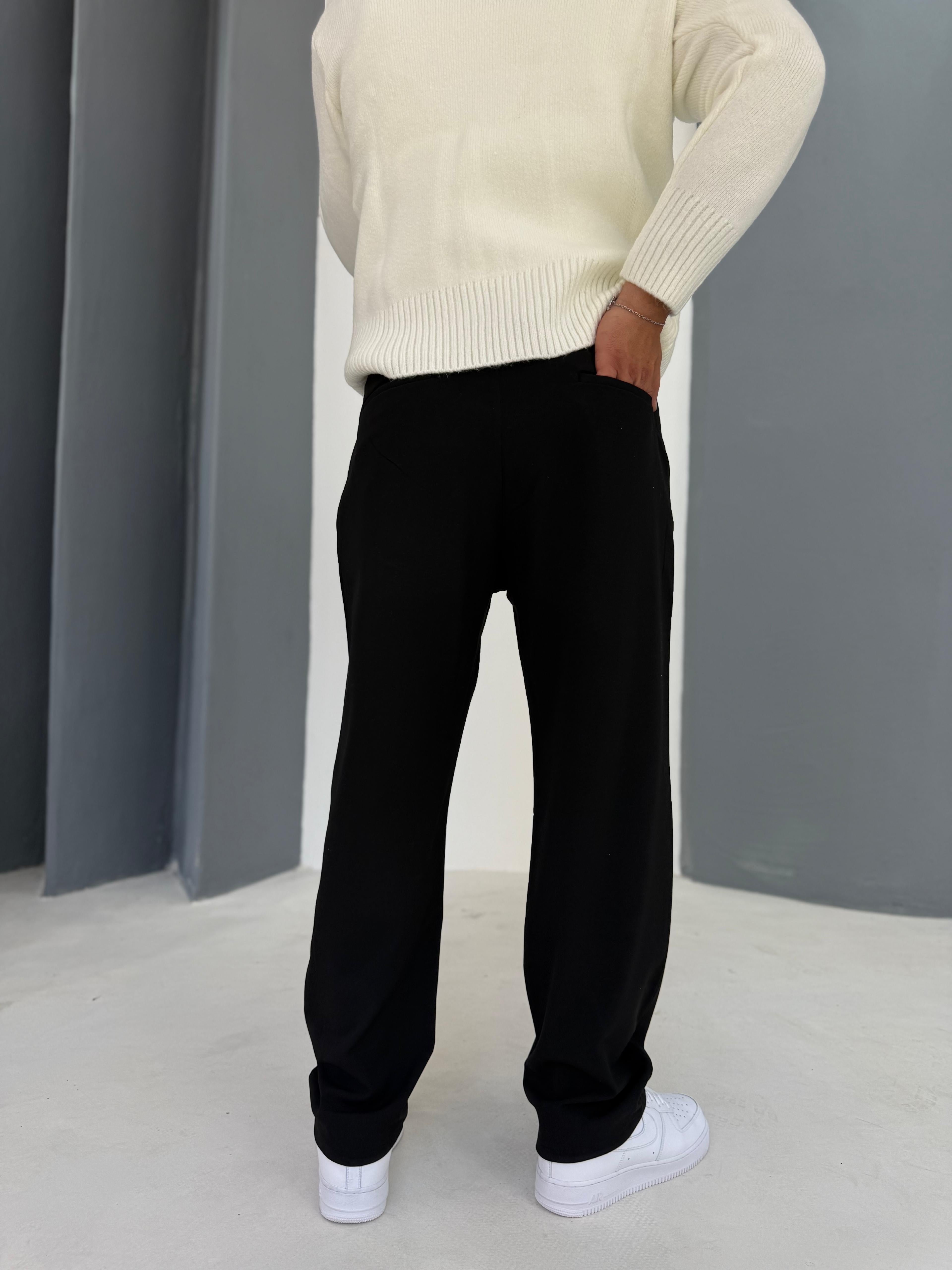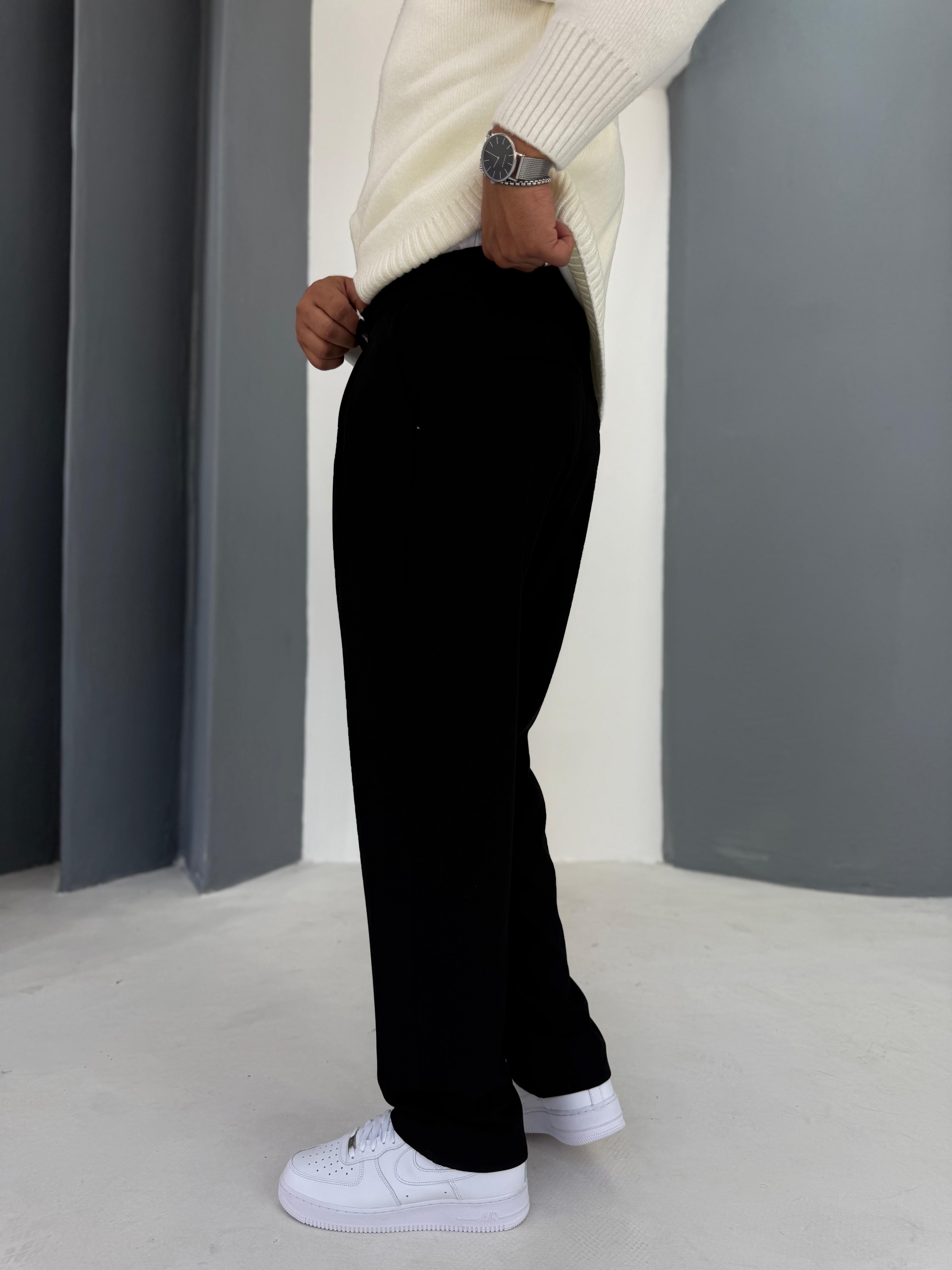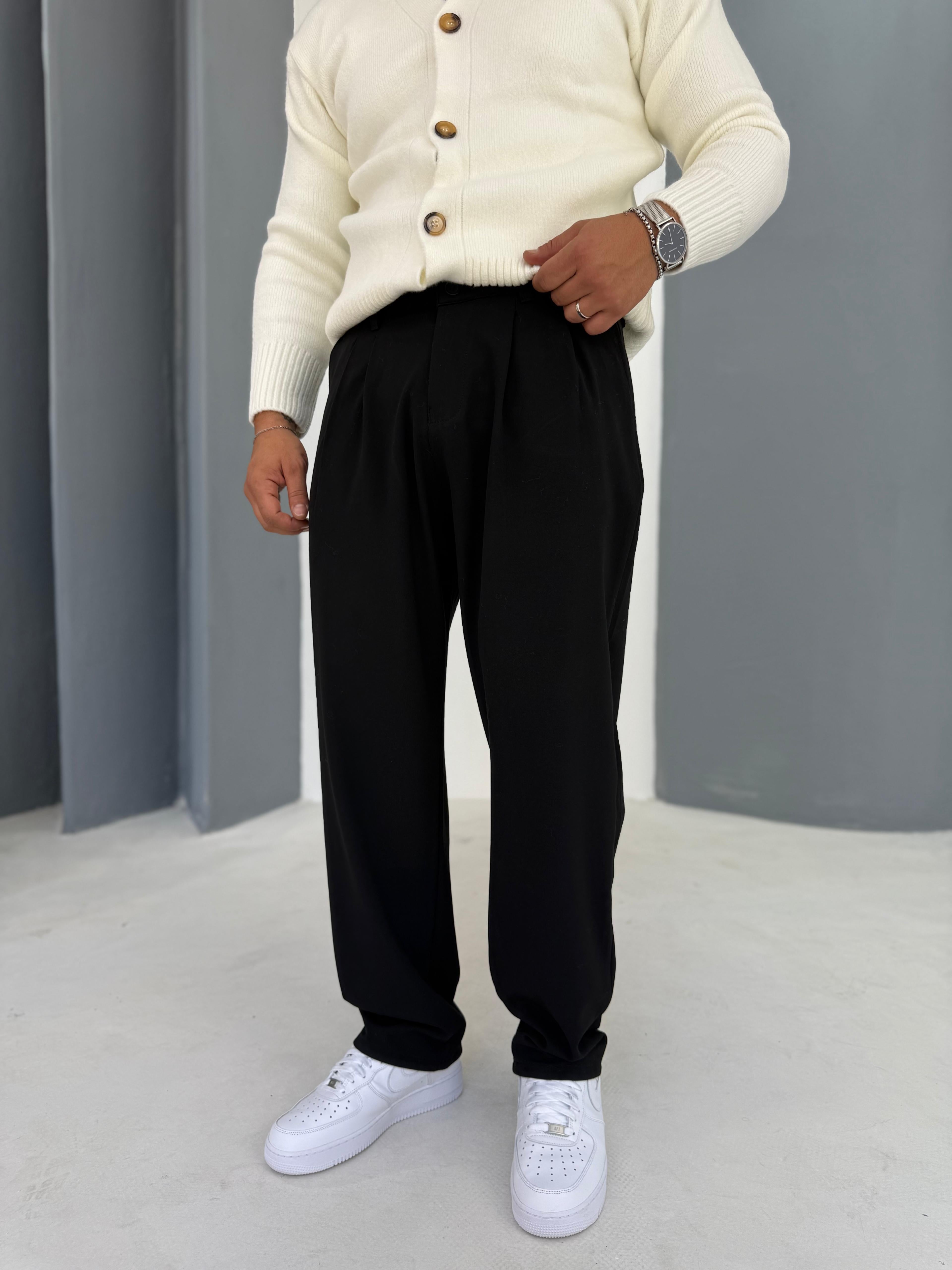 Pile Detaylı Baggy Siyah Kumaş Pantolon