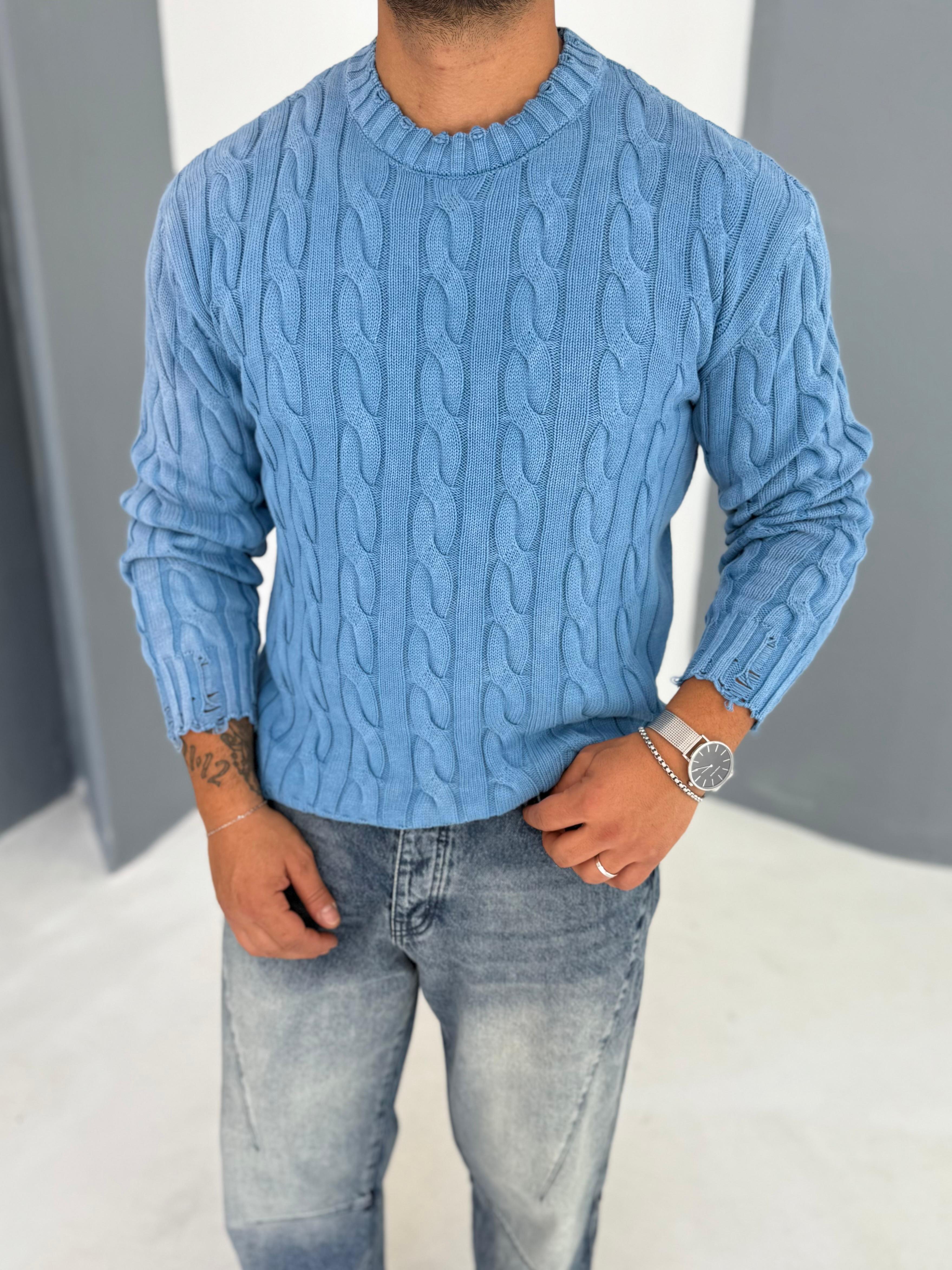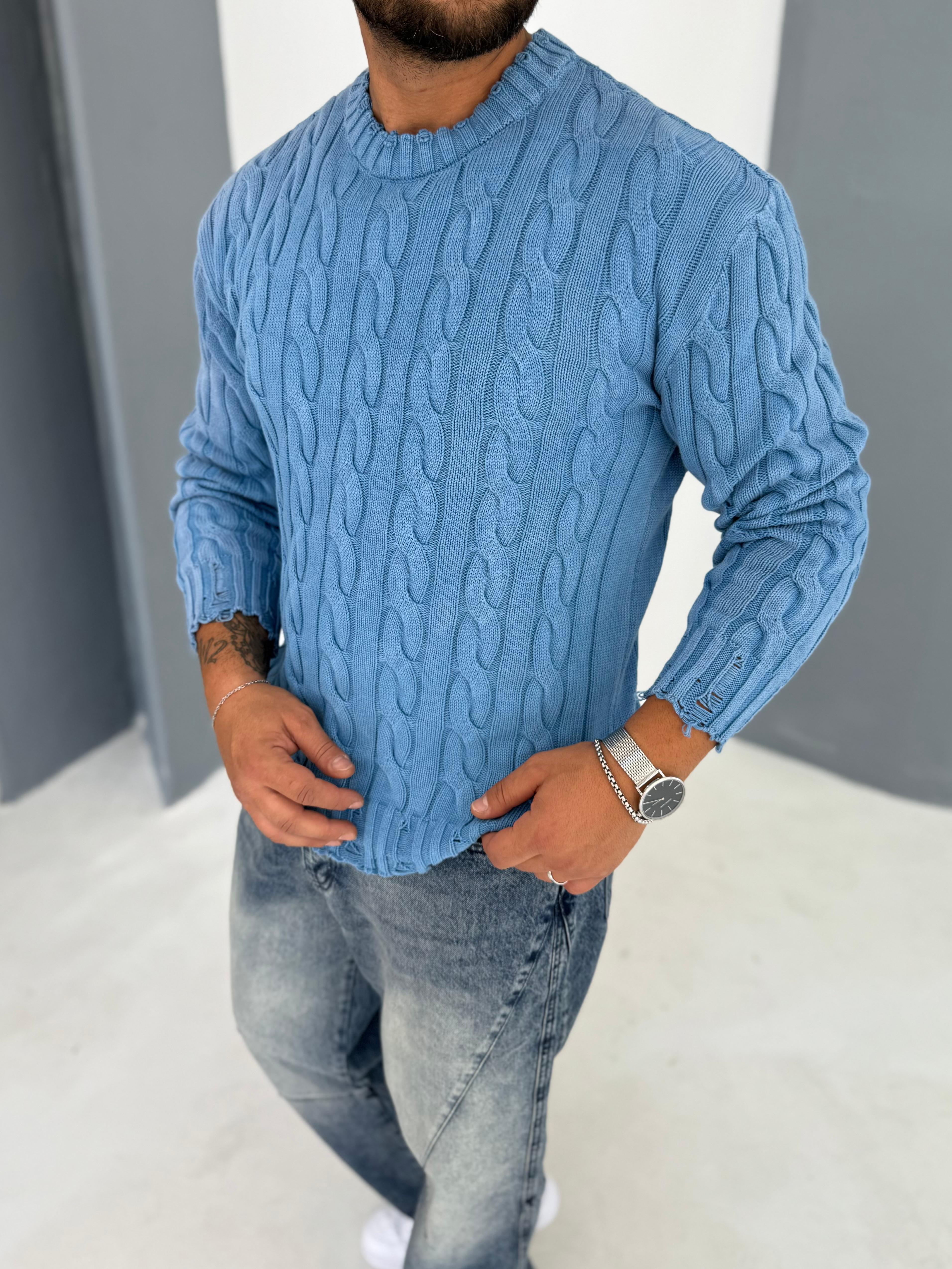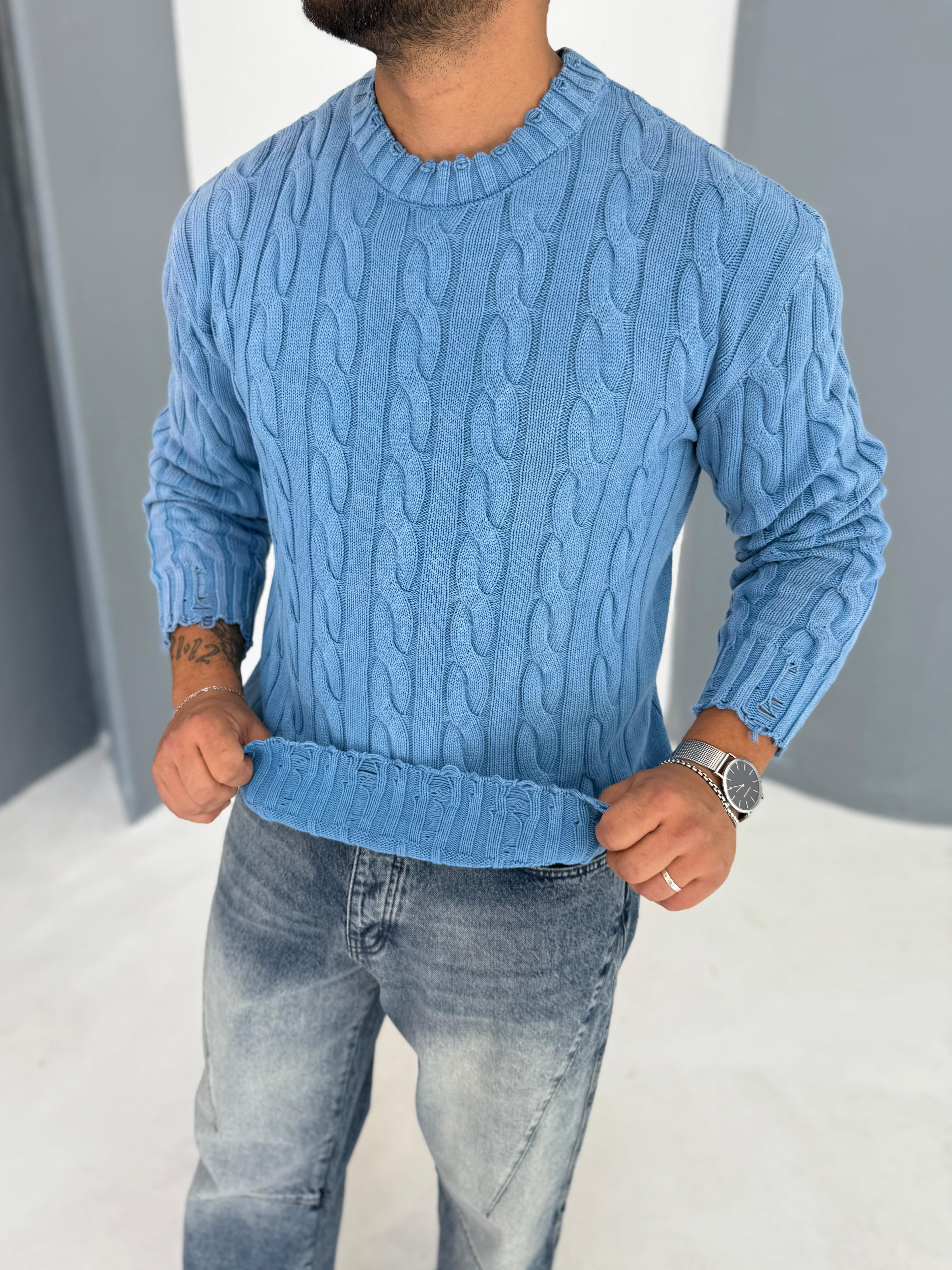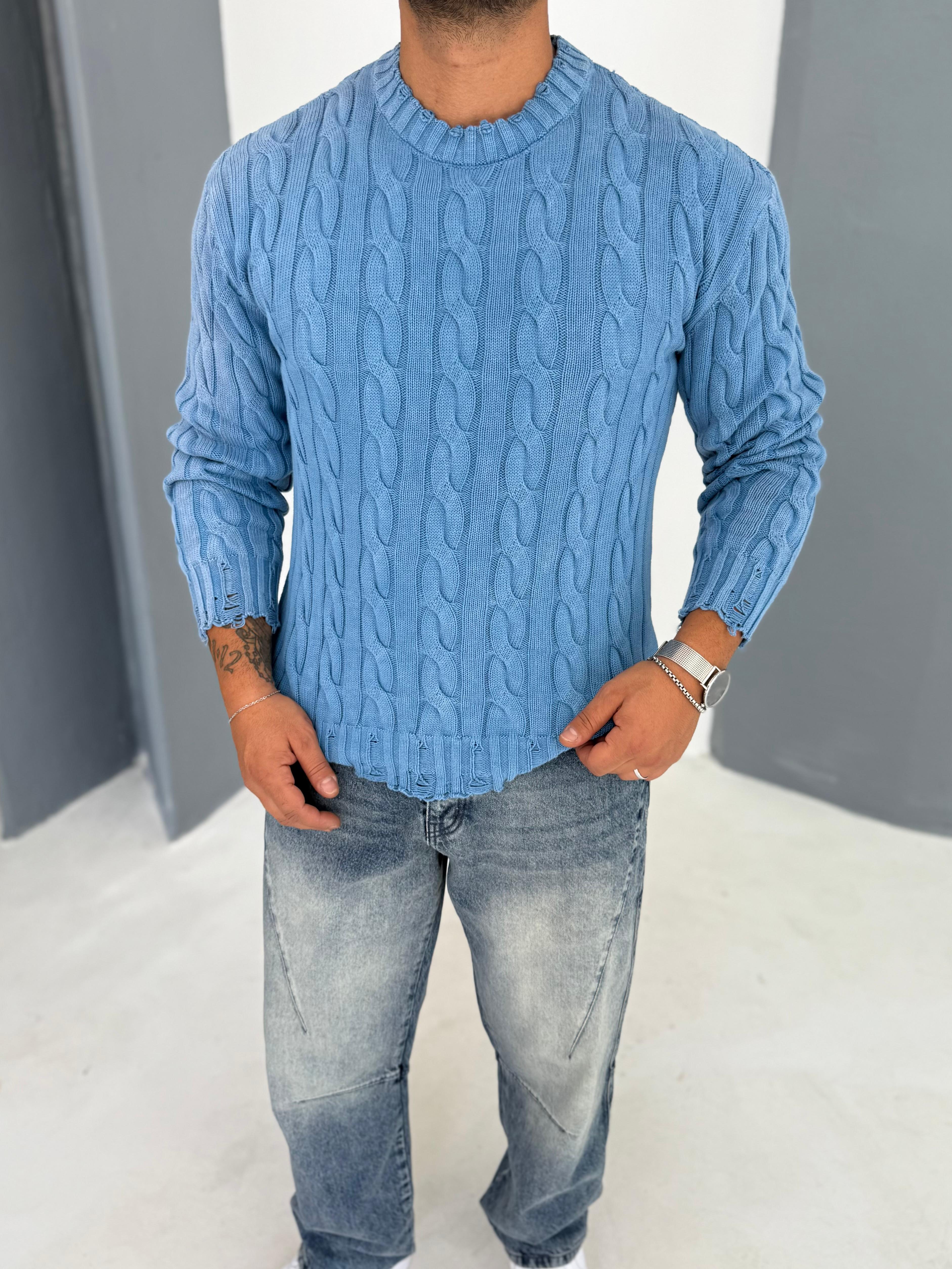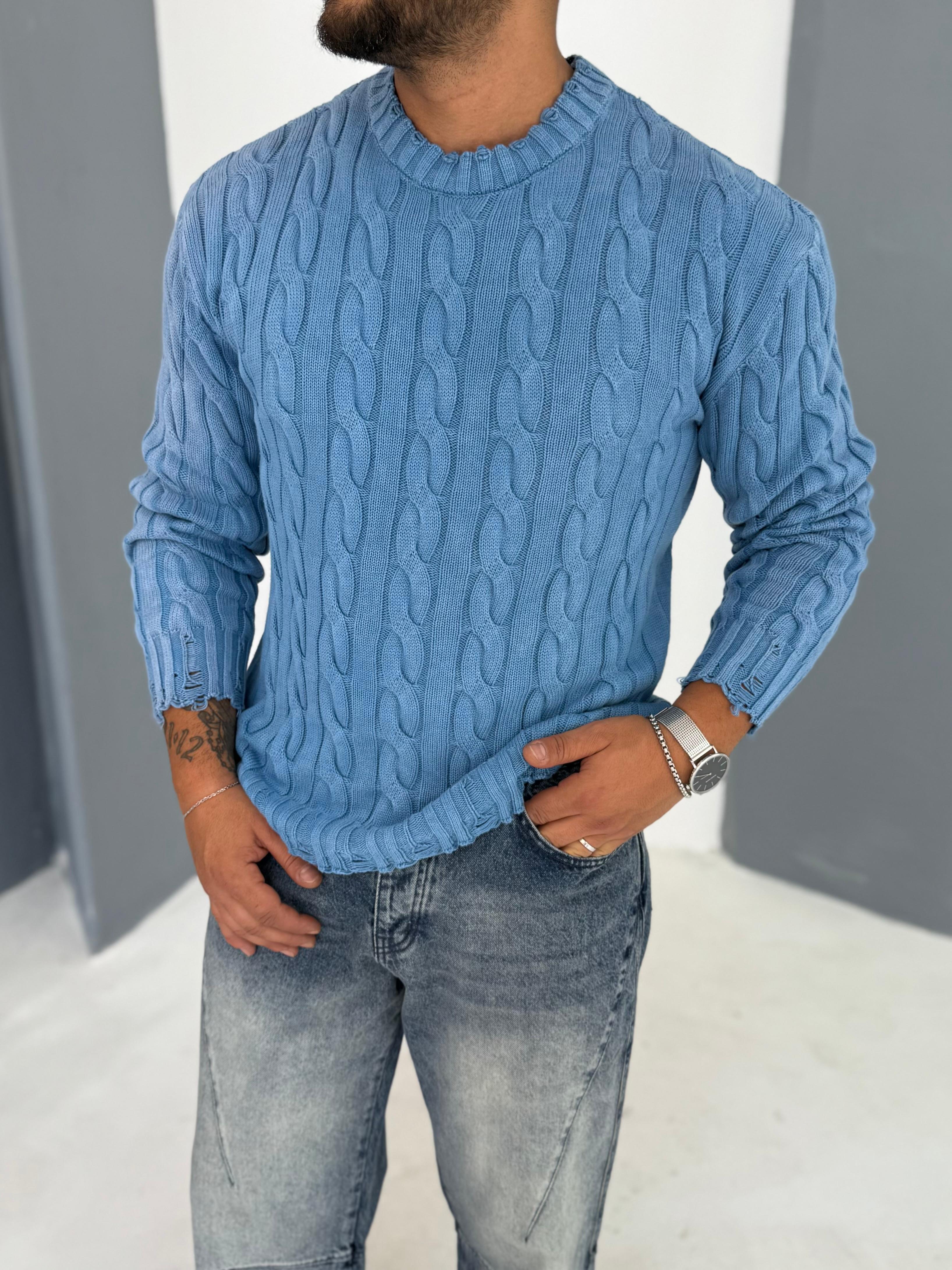 Yıkamalı Örgü Desen Mavi Triko